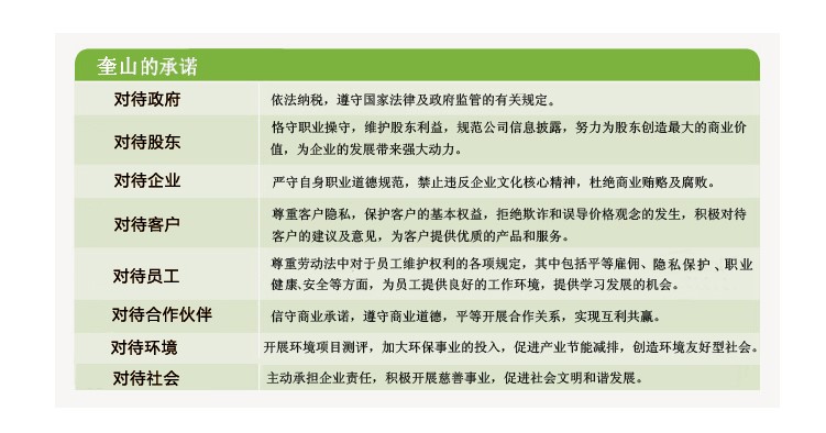 陽光宣言。奎山明確要求各單位在與第三方開展經濟合作時簽定廉潔條款,奎山向所有供應商承諾:不弄虛作假或為特定供應商設定排他性條款謀求中標;不接受供應商禮金、貴重物品及不正當宴請;不隱瞞供應商不良信息,不包庇供應商違反合同條款的行為。